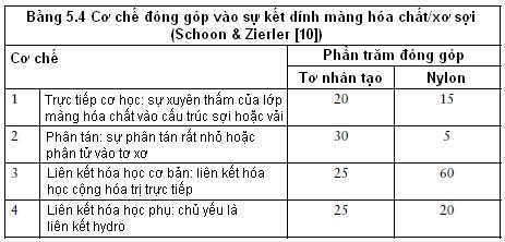 Ta thấy, các liên kết cộng hóa trị được hình thành chủ yếu từ phản ứng trùng ngưng của các nhóm methylol của nhựa với các nhóm hydroxyl (tơ nhân tạo) hoặc amide (nylon) của chuỗi polymer. Mặc dù tơ nhân tạo có nhiều nhóm hydroxyl, dễ phản ứng hơn nhưng do sự cản trở không gian làm rối loạn sự cân bằng, khoảng cách lặp lại của các nhóm methylol trong nhựa gần hơn trong trường hợp nylon (nhiều liên kết hơn trên một đơn vị chiều dài) so với trường hợp tơ nhân tạo. Bảng sau đây sẽ tóm tắt các liên kết đóng góp cho sự kết dính giữa chất kết dính – sợi cho trường hợp tơ nhân tạo và nylon.